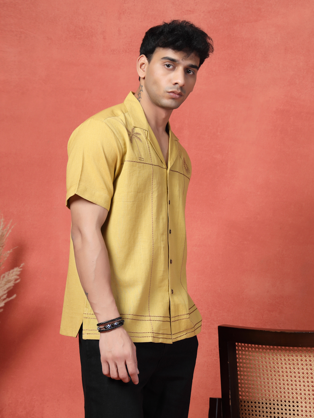 Upgrade your wardrobe with this Men’s Mustard Embroidered Cotton Cuban Collar Shirt, crafted for a bold yet refined look. Made from premium cotton fabric, this shirt features sharp embroidery detailing that adds a strong and stylish edge. Designed with a structured Cuban collar and half sleeves, it offers a confident, modern silhouette. Durable, breathable, and easy to style, this shirt is perfect for casual outings, evening wear, and statement looks.