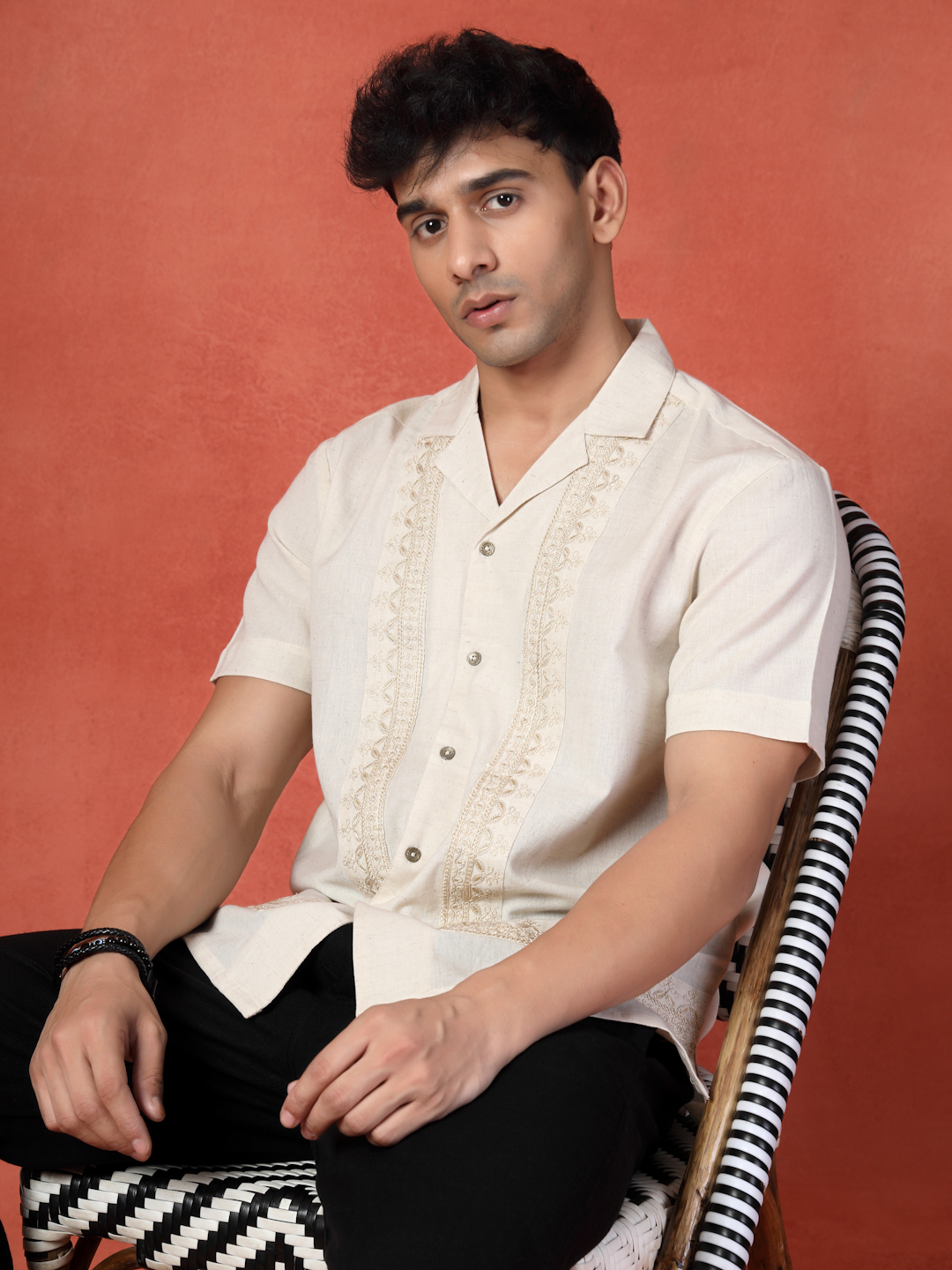 Step into effortless sophistication with this Men’s White Embroidered Cotton Cuban Collar Shirt, designed for a clean yet powerful style statement. Crafted from premium cotton fabric, this shirt features subtle embroidery that adds understated elegance. The structured Cuban collar and half sleeves create a timeless masculine silhouette, making it suitable for casual outings, festive occasions, and smart everyday wear. Comfortable, versatile, and stylish, this shirt is a must-have wardrobe essential.
