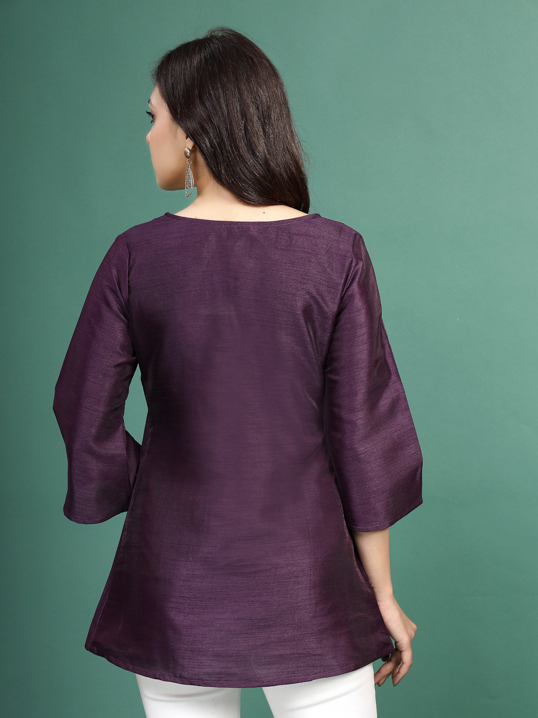 The delicate floral embroidery placed along the yoke enhances its ethnic charm, while the rich wine color gives it a sophisticated appeal. Designed with a round neckline and 3/4 sleeves, this top offers a flattering fit that pairs effortlessly with trousers, jeans, or palazzos. Perfect for office wear, casual outings, and semi-formal occasions.