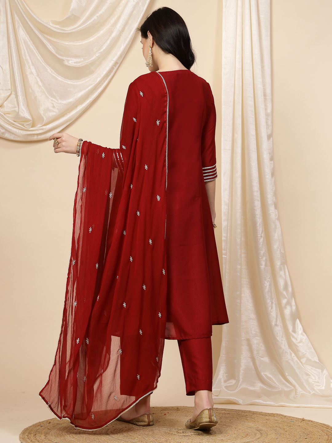 Step into timeless sophistication with this Women Maroon Mirror Work Embroidered Anarkali Kurta with Trouser & Dupatta. Crafted from rich silk fabric, this elegant kurta set offers a luxurious feel with a graceful drape, making it perfect for festive celebrations.