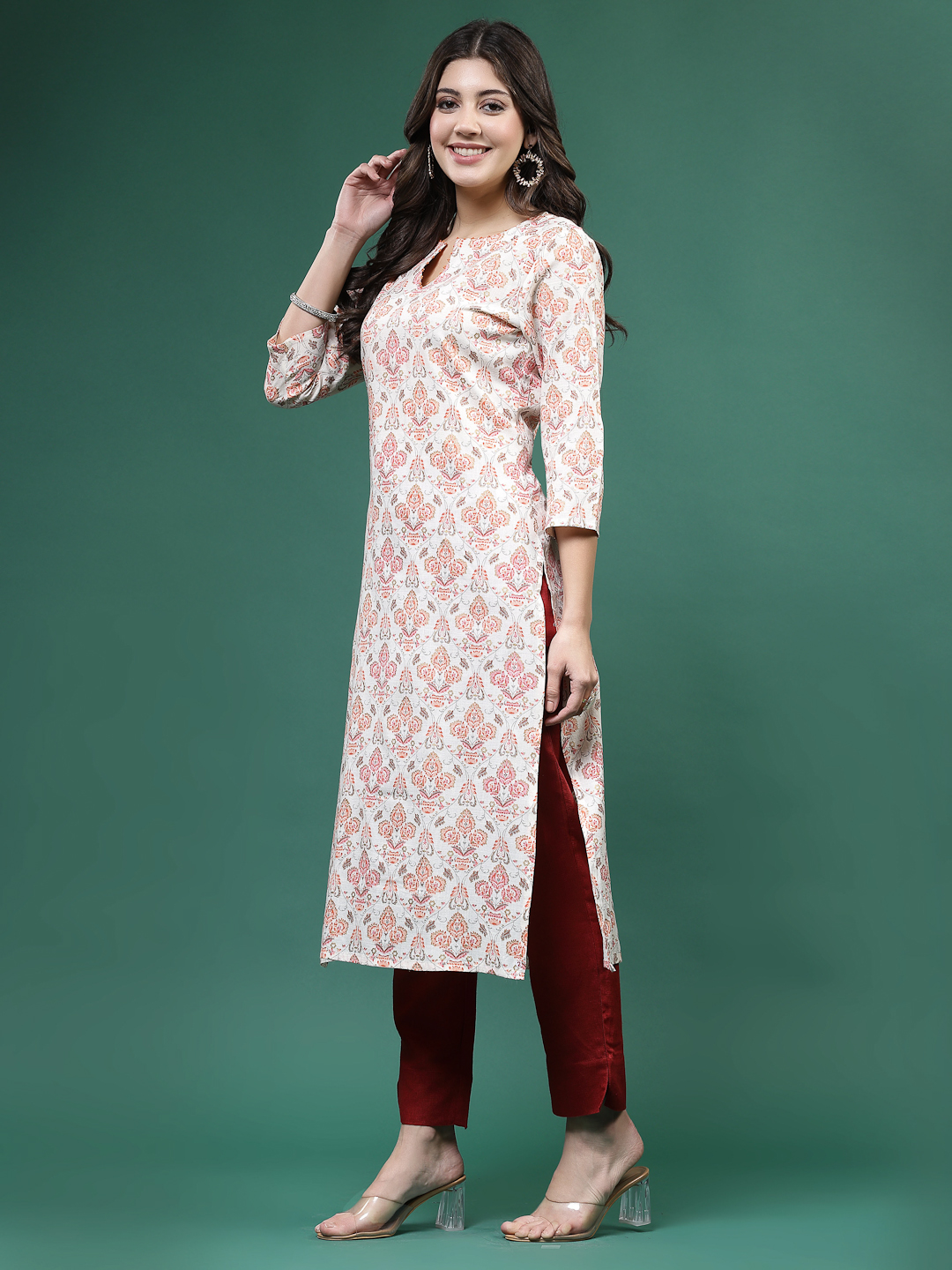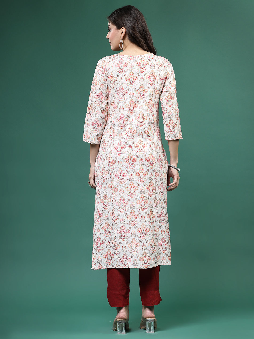 Designed in a classic straight-fit silhouette, it features delicate printed detailing and 3/4 sleeves for a refined finish. Perfect for work wear, casual outings, and festive gatherings, this versatile kurta blends everyday comfort with effortless style.