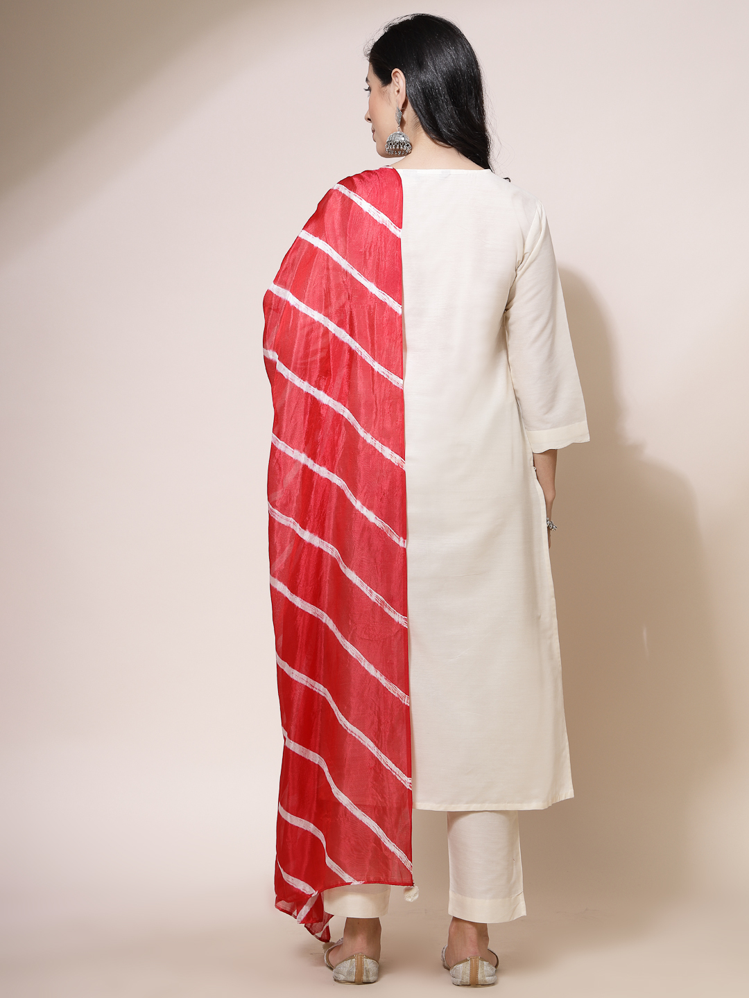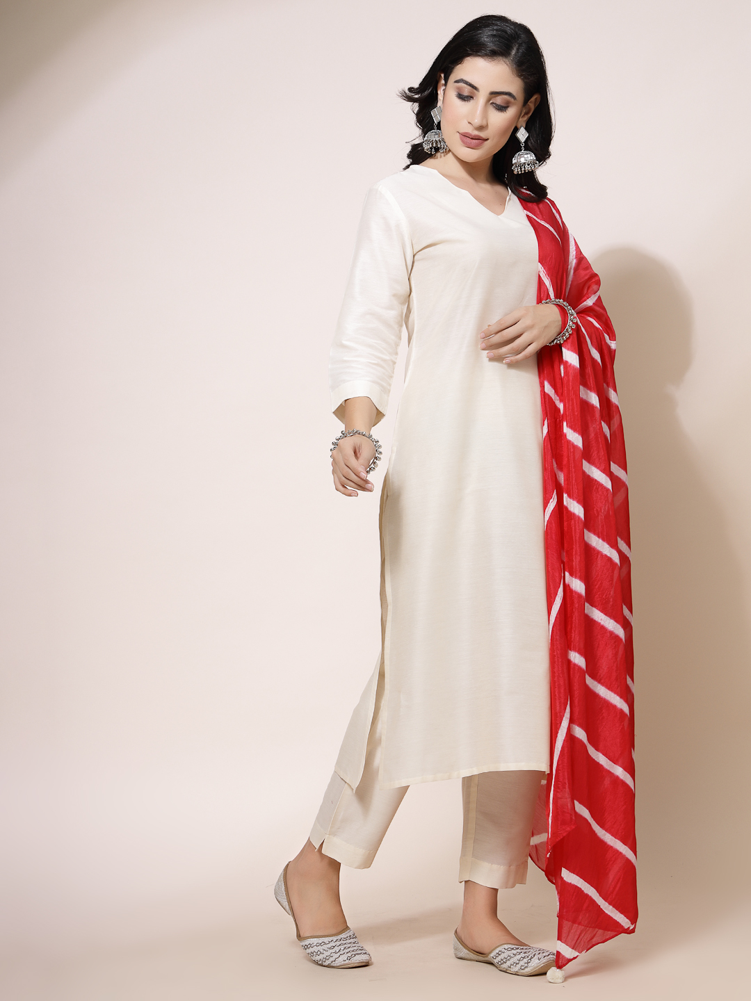 Color: Off-white kurta & trousers with red dupatta