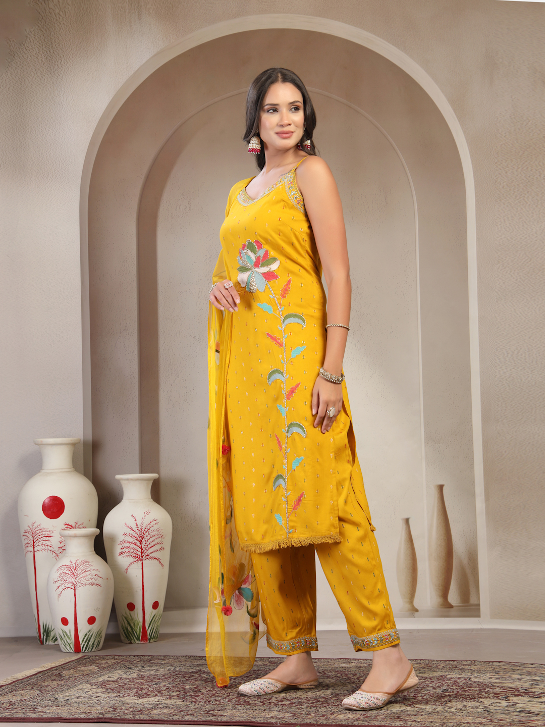 Women Yellow Color Embroidery Kurta With Trouser & Dupatta Set