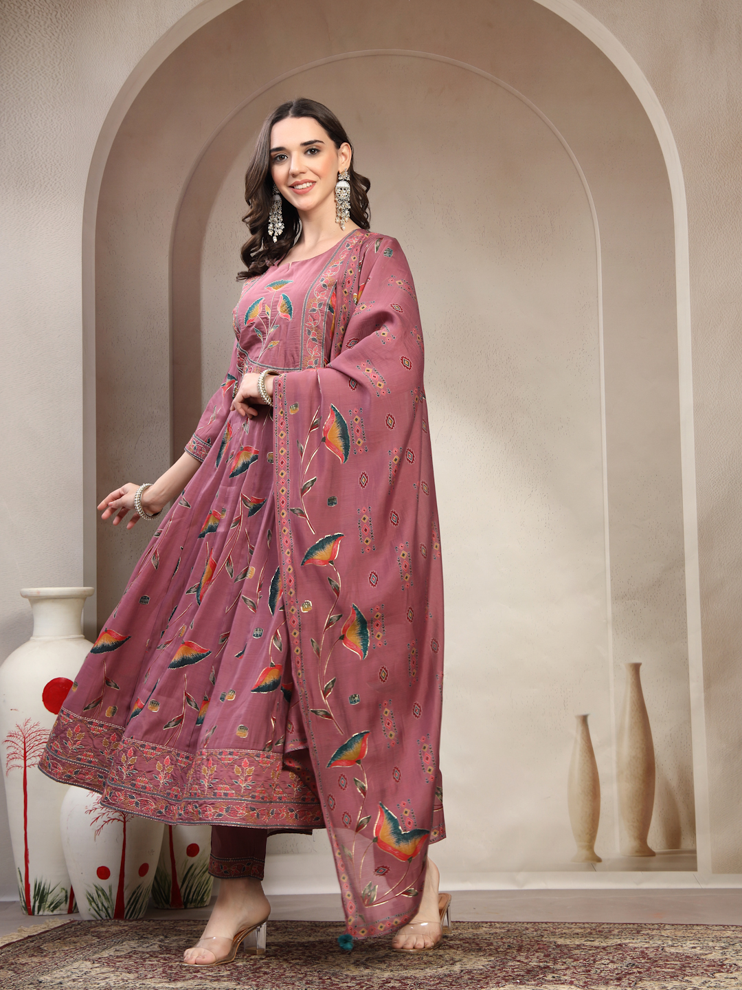 Women Mauve Color Embroidery Anarkali Kurta Trouser With dupatta set